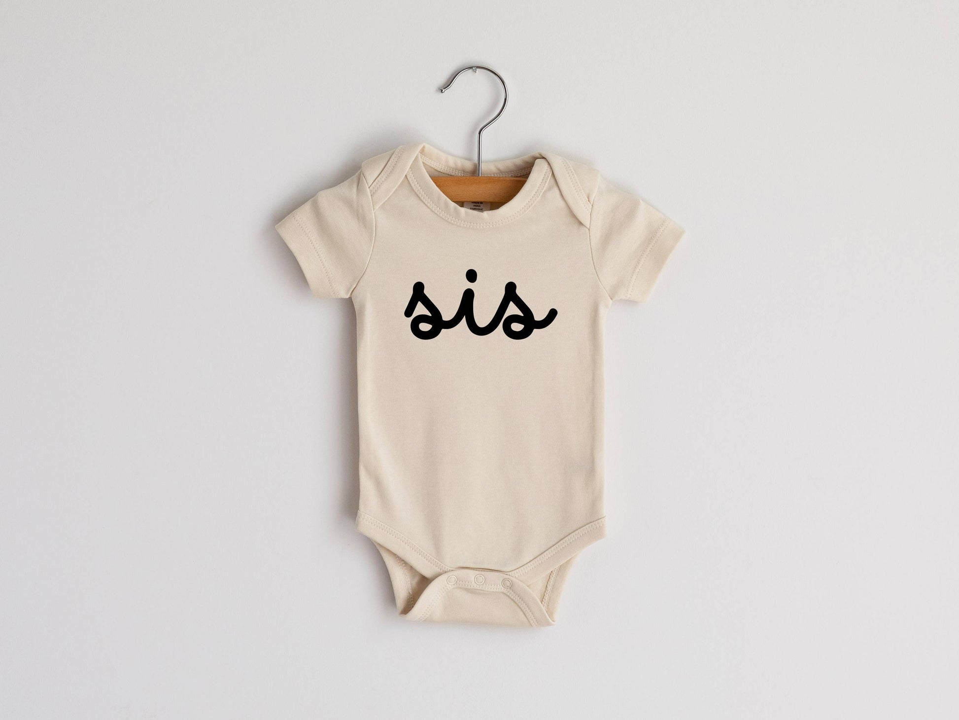 "Sis" A fresh, modern design for the sisters! This super-soft, 100% organic cotton outfit features modern script typography in crisp black ink on a luxe cream colored bodysuit - designed with love and screen printed in-house.