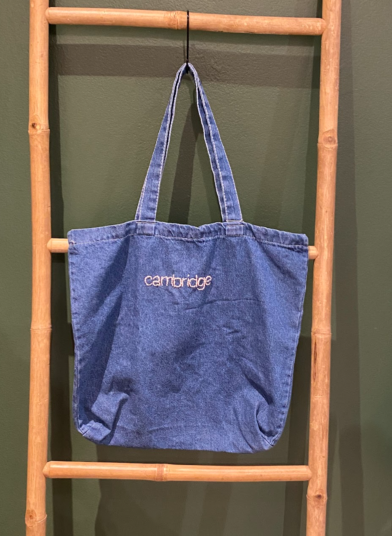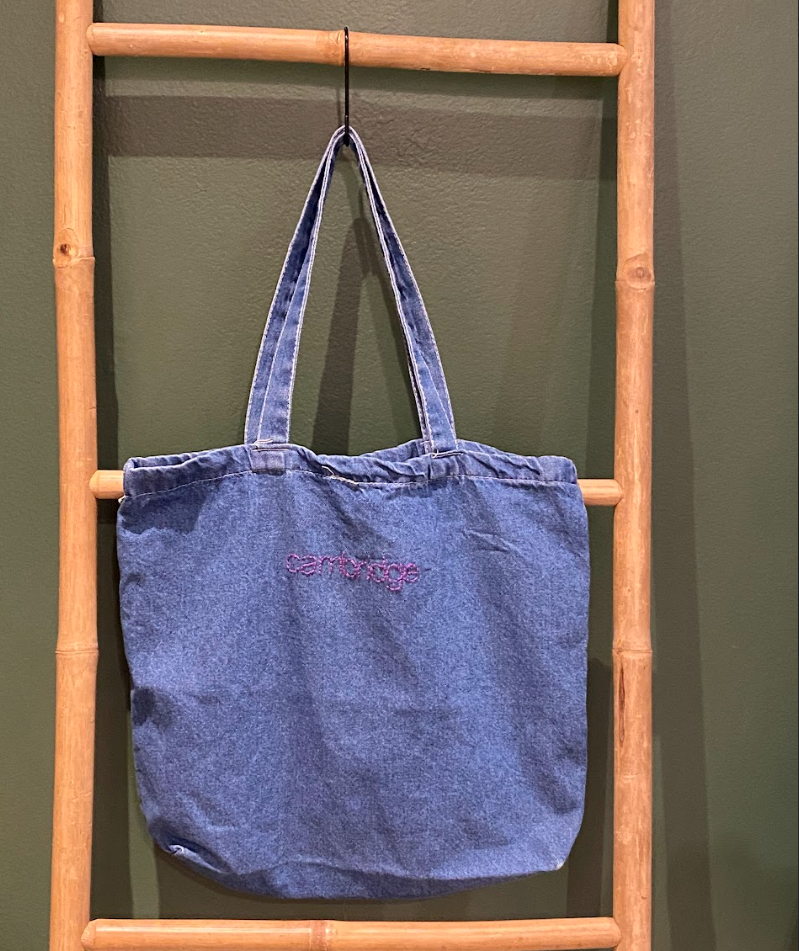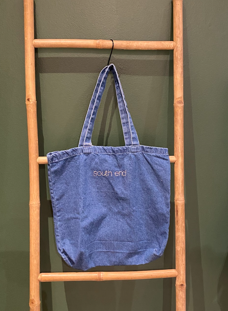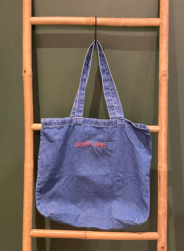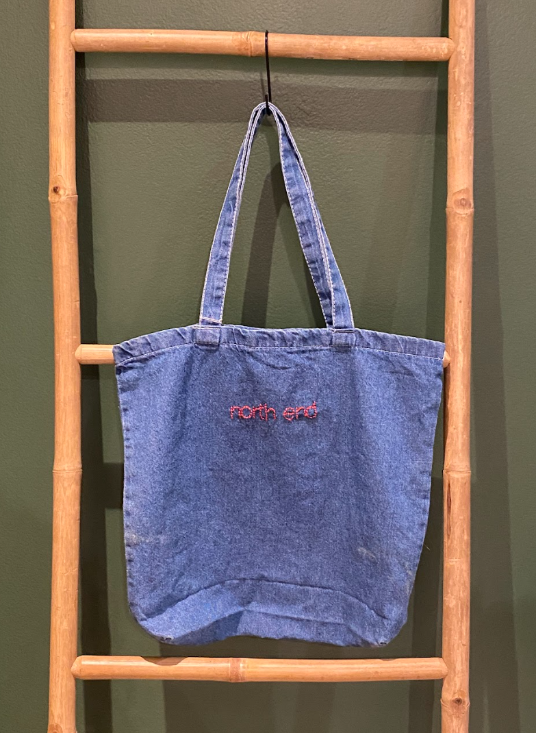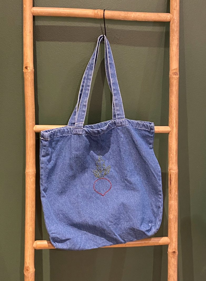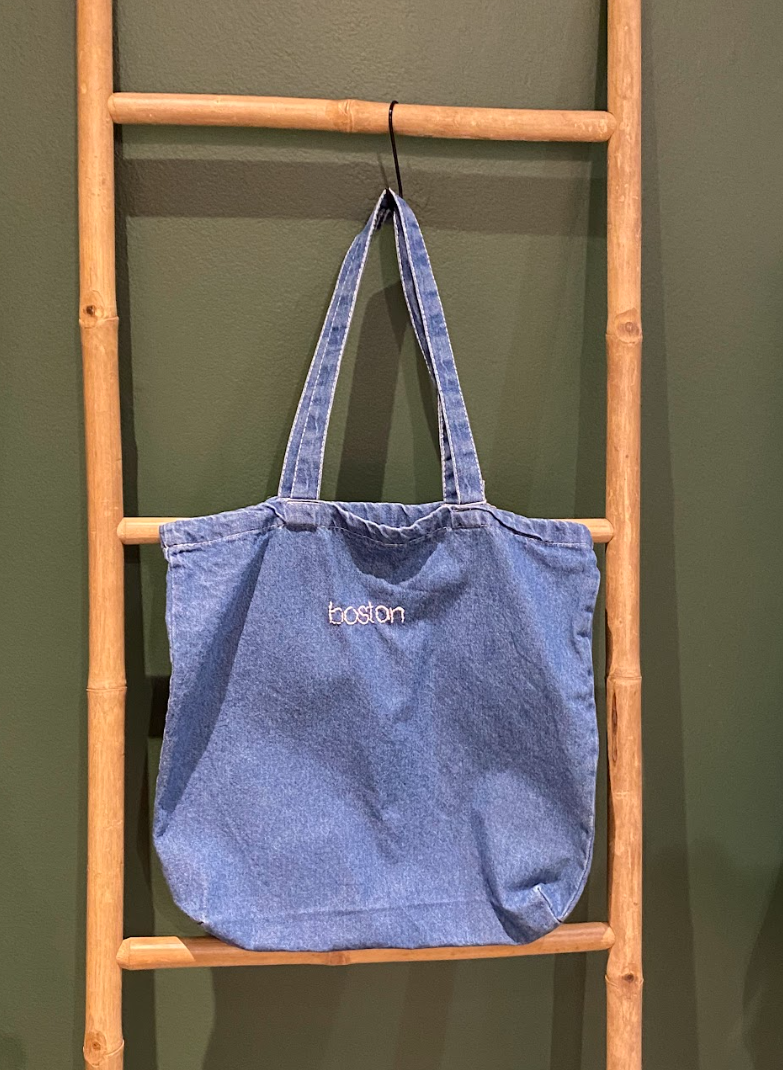These denim tote bags are hand embroidered in our Boston shop + studio.