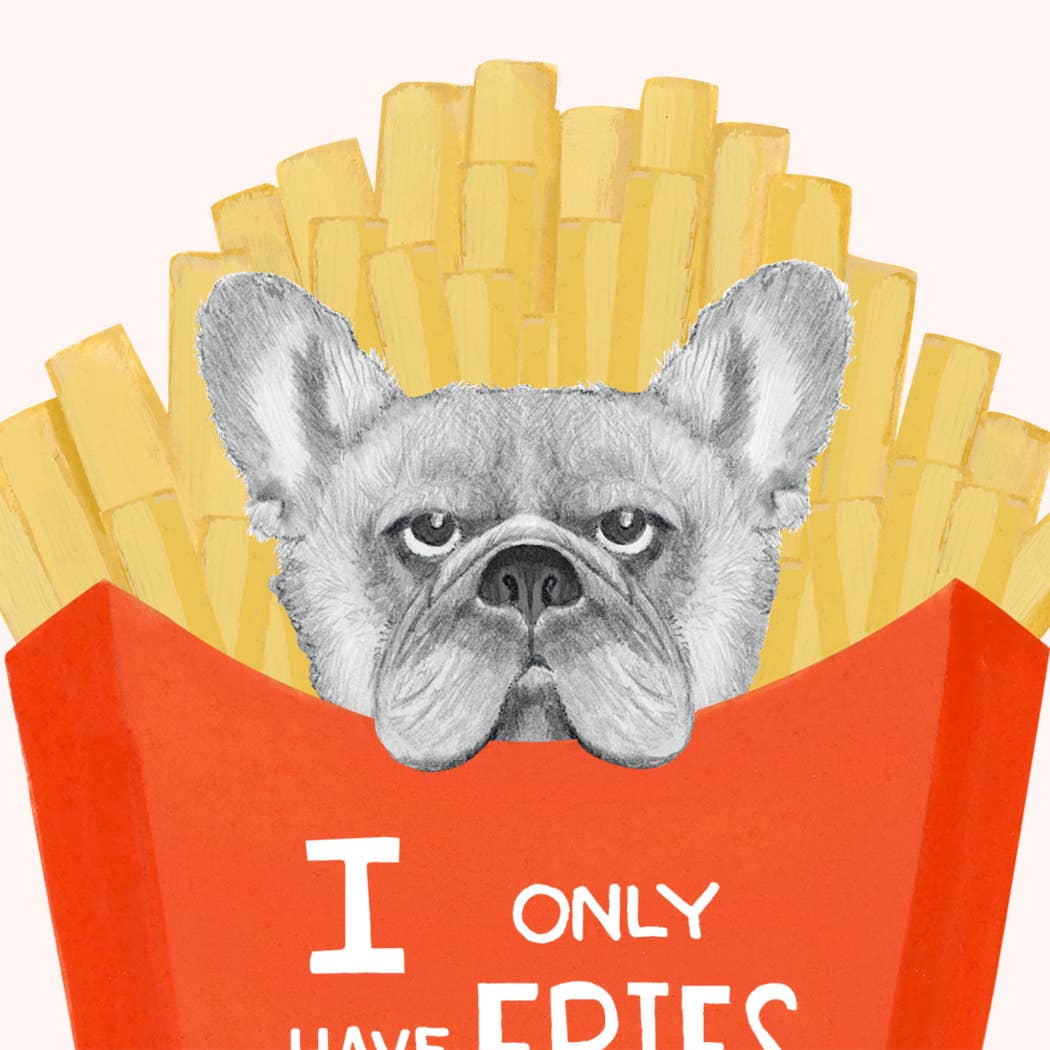A hand drawn frenchie and French fries! Text reads "I Only have Fries for You"