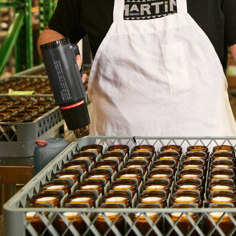 Our candles are simple - they're all made with 100% domestically grown soy wax, fine fragrance oils, and cotton-core wicks.